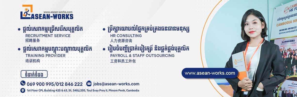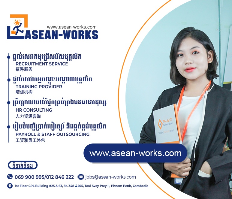 ឱកាសការងារថ្មីៗលើកយកមកចែកជូនបងប្អូន និងប្រិយមិត្តរបស់ Asean-Works ទាំងអស់គ្នា។ នេះជាតុពិភាក្សាការងាររវាង លោក ម៉េង ហួរ និង កញ្ញា សុភា។សម្រាប់ព័ត៌មានបន្ថែម សូមទំនាក់ទំនងមកកាន់លេខទូរស័ព្ទ 069 900 955/069 900 774ឬអ៉ីម៉ែលមកកាន់ recruitment.2@asean-works.com / marketing@asean-works.comto join our channel: https://t.me/joinchat/AAAAAEzITVvgAdyDqKJI5Q